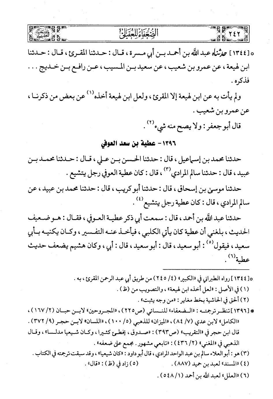 [1341] (1) حدثناه جدي وإبراهيم بن عبد الله الكشي (2)، قالا: حدثنا حجاج بن نصير، قال: حدثنا حسان بن إبراهيم الكرماني، عن عطية بن أبي عطية، عن عطاء بن أبي رباح، عن عمرو بن شعيب، قال: كنت عند سعيد بن المسيب جالسا، فذكروا أن أقواما يقولون: إن الله قدر كل شيء ما خلا الأعمال، قال: فوالله ما رأيت سعيد غضب غضبا قط أشد منه، حتى هم بالقيام ثم سكن، فقال: أتكلموا به ؟ أما والله لقد سمعت فيهم بحديث كفاهم به شرا، ويحهم لو يعلمون، قال قلت: رحمك الله يا أبا محمد، وما هو ؟ قال: فنظر إلي وقد سكن بعض غضبه، فقال: حدثني رافع بن خديج، أنه سمع رسول الله صلى الله عليه وسلمع قال: «يكون قوم من أمتي، يكفرون بالله وبالقرآن، وهم لا يشعرون، كما كفرت اليهود والنصارى»، قال: قلت: جعلت فداك يا رسول الله، وكيف ذاك ؟ قال: «يقرون ببعض القدر، ويكفرون ببعض»، قال: قلت: وما يقولون ؟ قال: «يجعلون إبليس عِدلا لله في خلقه وقوته ورزقه، ويقولون: الخير من الله والشر من إبليس، فيقرءون على ذلك كتاب الله، فيكفرون بالقرآن بعد الإيمان والمعرفة، فما تلقى أمتي منهم من العداوة والبغضاء والجدال، أولئك زنادقة هذه الأمة في زمانهم، ثم يكون ظلم (3)، فيا له من ظلم وحيف وأثرة، ثم يبعث الله طاعونا فيفني عامّتهم، ثم يكون الخسف، فما أقل من ينجو منهم، المؤمن يومئذ قليل فرحه، شديد غمّه، ثم يكون المسخ، فيمسخ الله عامة أولئك قردة وخنازير، ثم يخرج الدجال على أثر ذلك قريبا»، ثم بكى رسول الله صلى الله عليه وسلمع حتى بكينا لبكائه، قلنا: ما يبكيك يا رسول الله ؟ قال: «رحمة لهم الأشقياء؛ لأن منهم المتعبد، ومنهم المجتهد (4)،? مع أنهم ليسوا بأول من سبق إلى هذا القول وضاق بحمله ذرعا أن عامة من هلك من بني إسرائيل