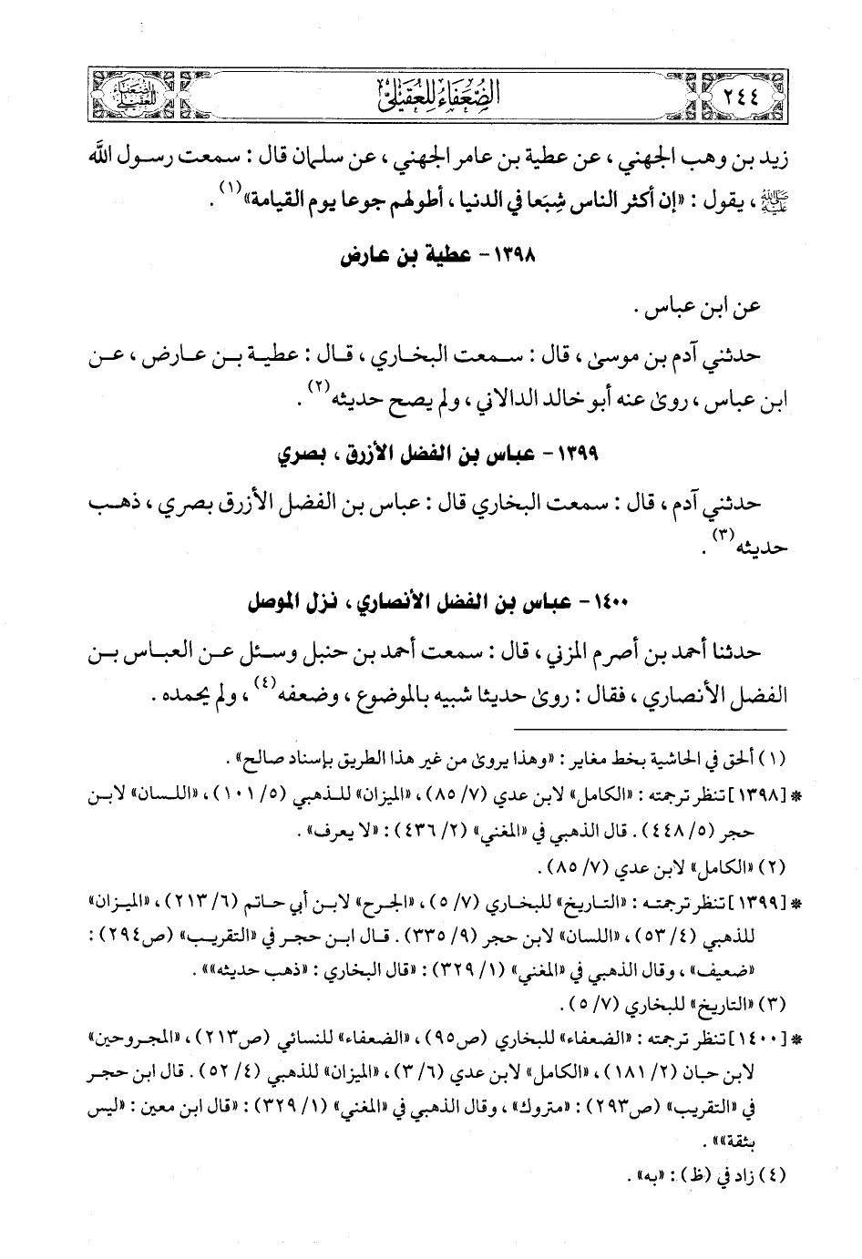 (4) * [1396] تنظر ترجمته: «الضعفاء» للنسائي (ص225) , «المجروحين» لابن حبان (2/ 167) , «الكامل» لابن عدي (7/ 84) , «الميزان» للذهبي (5/ 100) , «اللسان» لابن حجر (9/ 372). قال ابن حجر في «التقريب» (ص393): «صدوق، يخطئ كثيرا، وكان شيعيا مدلسا» , وقال الذهبي في «المغني» (2/ 436): «تابعي مشهور. مجمع على ضعفه».