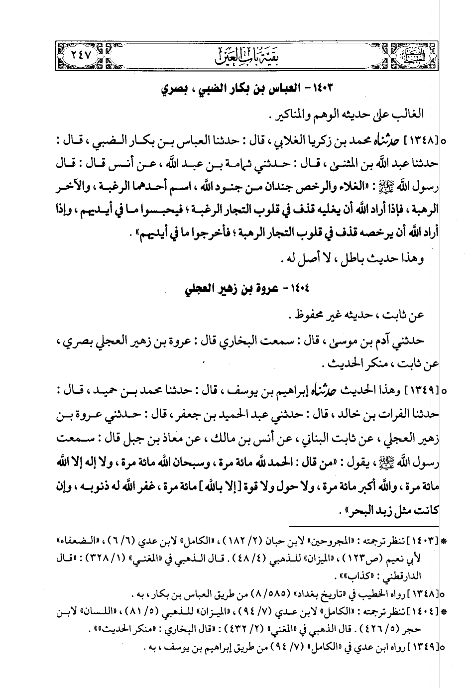 حدثني آدم بن موسى، قال: سمعت البخاري قال: حدثنا عباس بن الفضل الأنصاري - نزل الموصل - منكر الحديث (7).