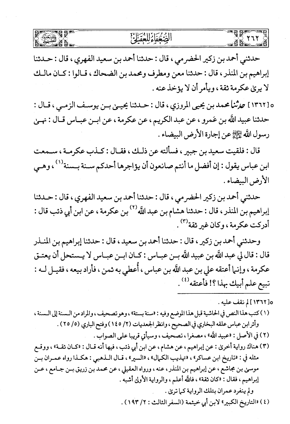 حدثنا زكريا بن يحيى الساجي، قال: حدثنا محمد بن موسى الحرشي (1)، قال: حدثنا عبد الله بن عيسى أبو خلف، قال: حدثنا يحيى البكاء، قال: سمعت ابن عمر يقول لنافع: اتق الله، ويحك يا نافع! ولا تكذب علي كما كذب عكرمة على ابن عباس، كما أحل الصرف، وأسلم ابنه صيرفيا.