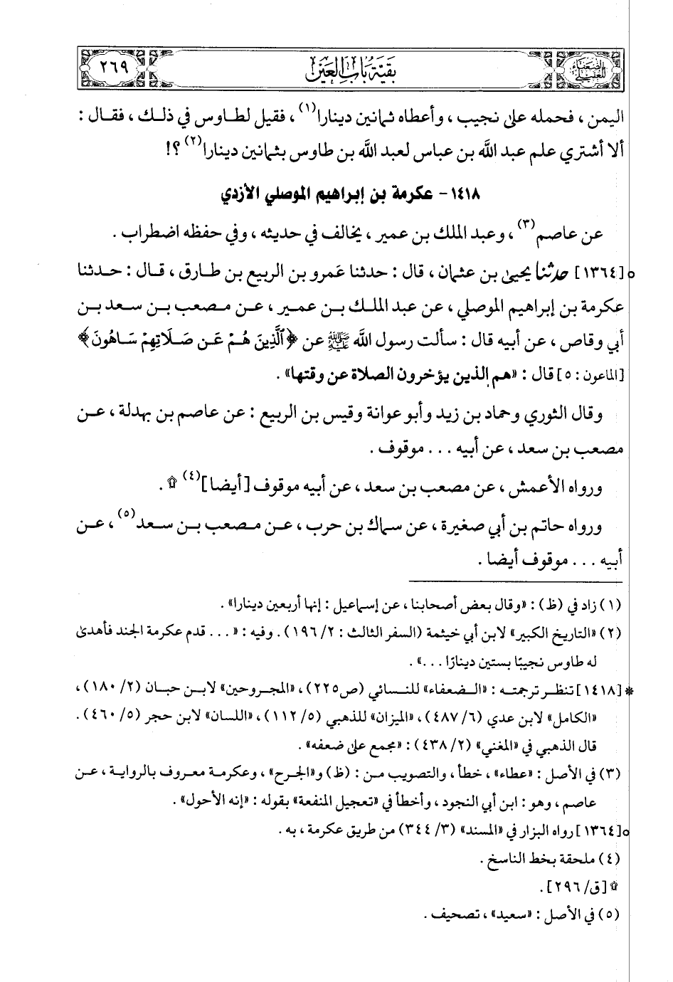 حدثنا (4) يحيى بن عثمان، قال: حدثنا نعيم بن حماد، قال: حدثنا جرير، عن مغيرة، قال: قيل لسعيد بن جبير: هل تعلم أحدا أعلم منك ؟ قال: نعم، عكرمة (5).