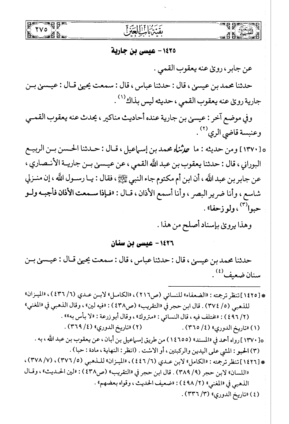 (1) * [1422] تنظر ترجمته: «الضعفاء» للبخاري (ص89) , «الضعفاء» للنسائي (ص216) , «المجروحين» لابن حبان (2/ 101) , «الكامل» لابن عدي (6/ 430) , «الميزان» للذهبي (5/ 382). قال ابن حجر في «التقريب» (ص439): «متروك» , وقال الذهبي في «المغني» (2/ 499): «تركه النسائي وغيره. وقال أبو زرعة: «ليس بالقوي»».