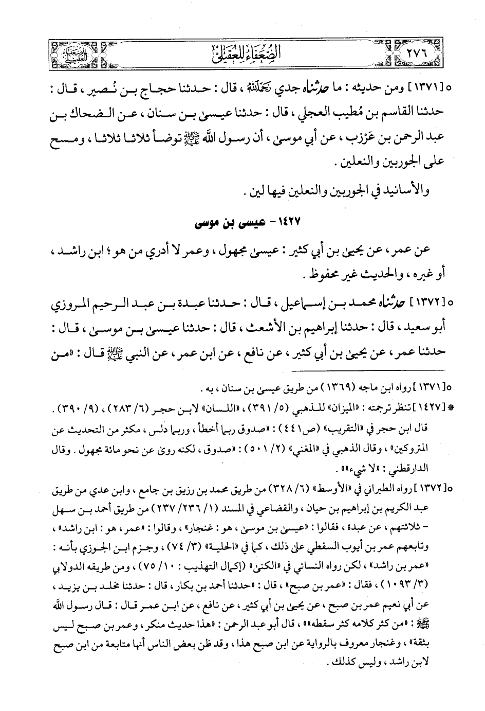 (3) * [1424] تنظر ترجمته: «العلل» لعبد الله بن أحمد (2/ 297، 382)، «الميزان» للذهبي (5/ 376) , «اللسان» لابن حجر (6/ 265). قال الذهبي في «المغني» (2/ 497): «لا يعرف».