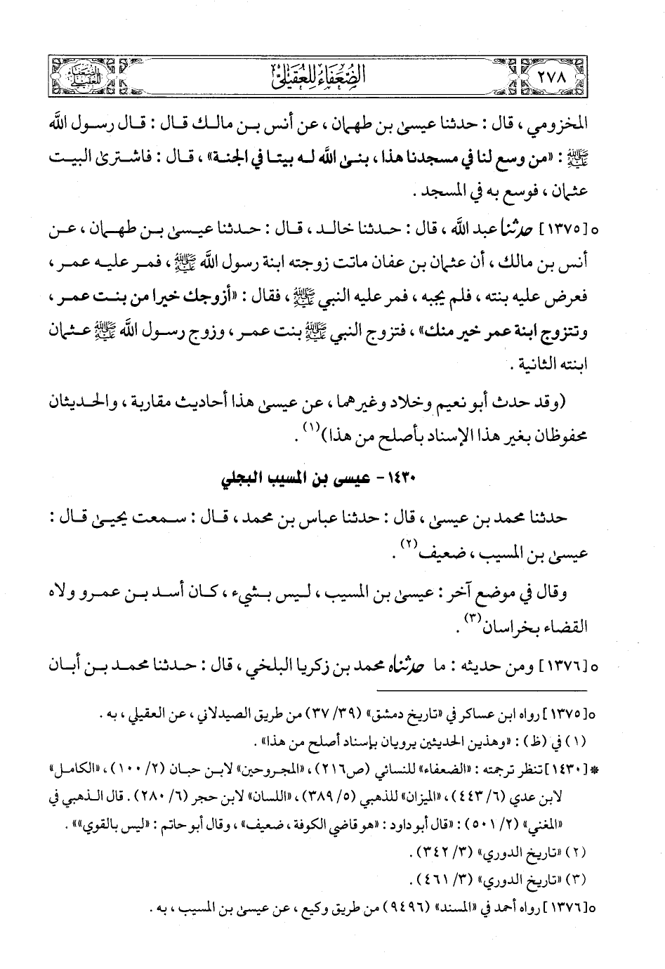 (2) * [1427] تنظر ترجمته: «الميزان» للذهبي (5/ 391) , «اللسان» لابن حجر (6/ 283) , (9/ 390). قال ابن حجر في «التقريب» (ص441): «صدوق ربما أخطأ، وربما دلس، مكثر من التحديث عن المتروكين» , وقال الذهبي في «المغني» (2/ 501): «صدوق، لكنه روى عن نحو مائة مجهول. وقال الدارقطني: «لا شيء»».