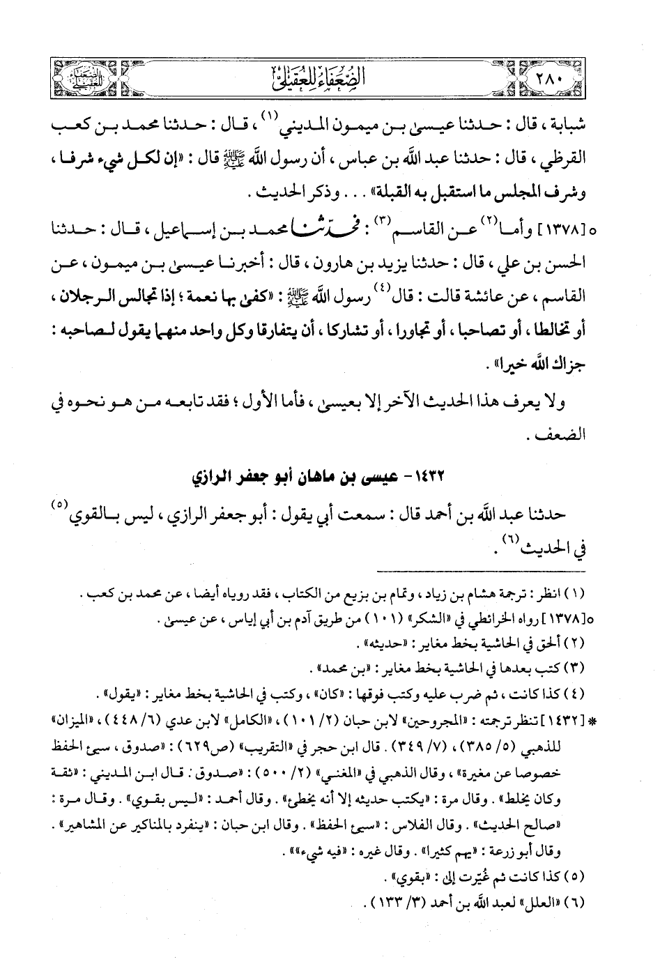 حدثنا محمد بن عيسى، قال: حدثنا عباس بن محمد، قال: سمعت يحيى قال: عيسى بن المسيب، ضعيف (4).