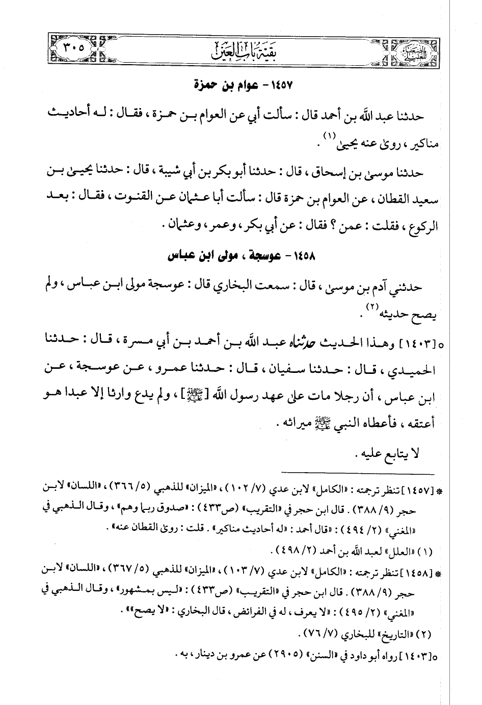 (1) * [1452] تنظر ترجمته: «الإكمال» لابن ماكولا (6/ 7)، «الميزان» للذهبي (4/ 22) , «اللسان» لابن حجر (4/ 382). قال الذهبي في «المغني» (1/ 324): «لا يصح حديثه».