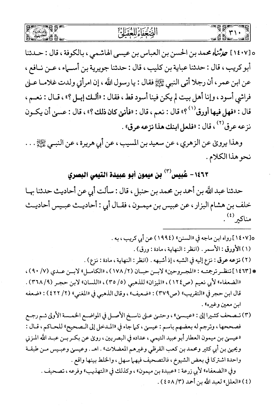 (3) * [1461] تنظر ترجمته: «التاريخ» للبخاري (7/ 72)، «الجرح» لابن أبي حاتم (7/ 28، 29)، «الميزان» للذهبي (4/ 55) , «اللسان» لابن حجر (4/ 417). قال الذهبي في «المغني» (1/ 330): «من الغلاة».