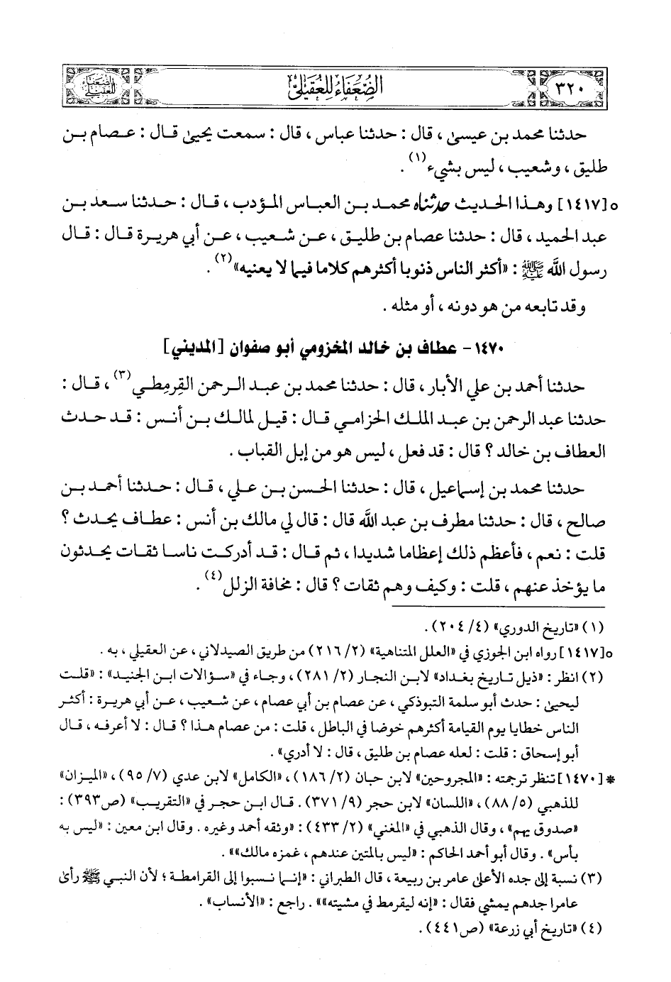 (1) * [1466] تنظر ترجمته: «الجرح» لابن أبي حاتم (6/ 386)، «الميزان» للذهبي (5/ 369) , «اللسان» لابن حجر (6/ 250، 253). قال الذهبي في «المغني» (2/ 495): «قال ابن معين: «لا شيء»».