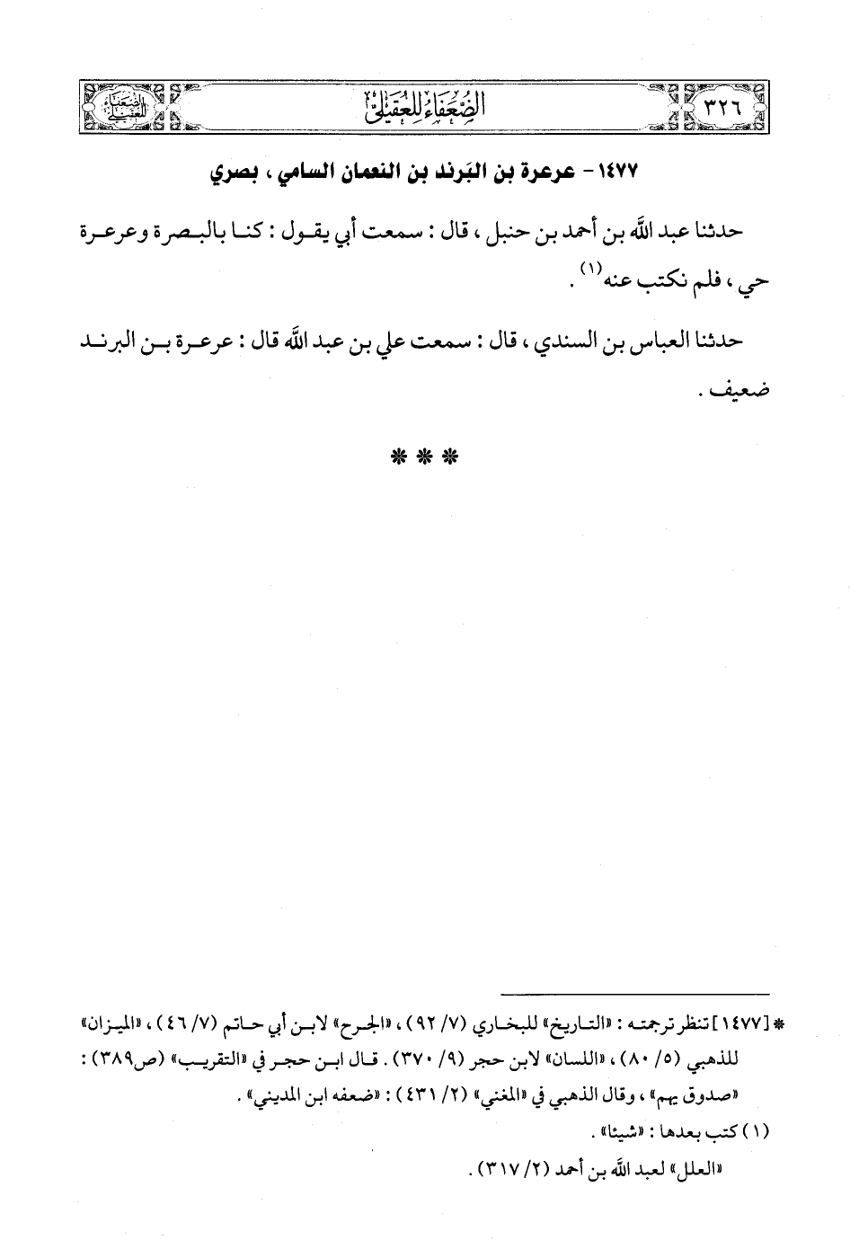 (3) * [1473] تنظر ترجمته: «الميزان» للذهبي (5/ 81) , «اللسان» لابن حجر (5/ 425). قال الذهبي في «المغني» (2/ 431): «لا يعرف. وحديثه منكر؛ بل موضوع».