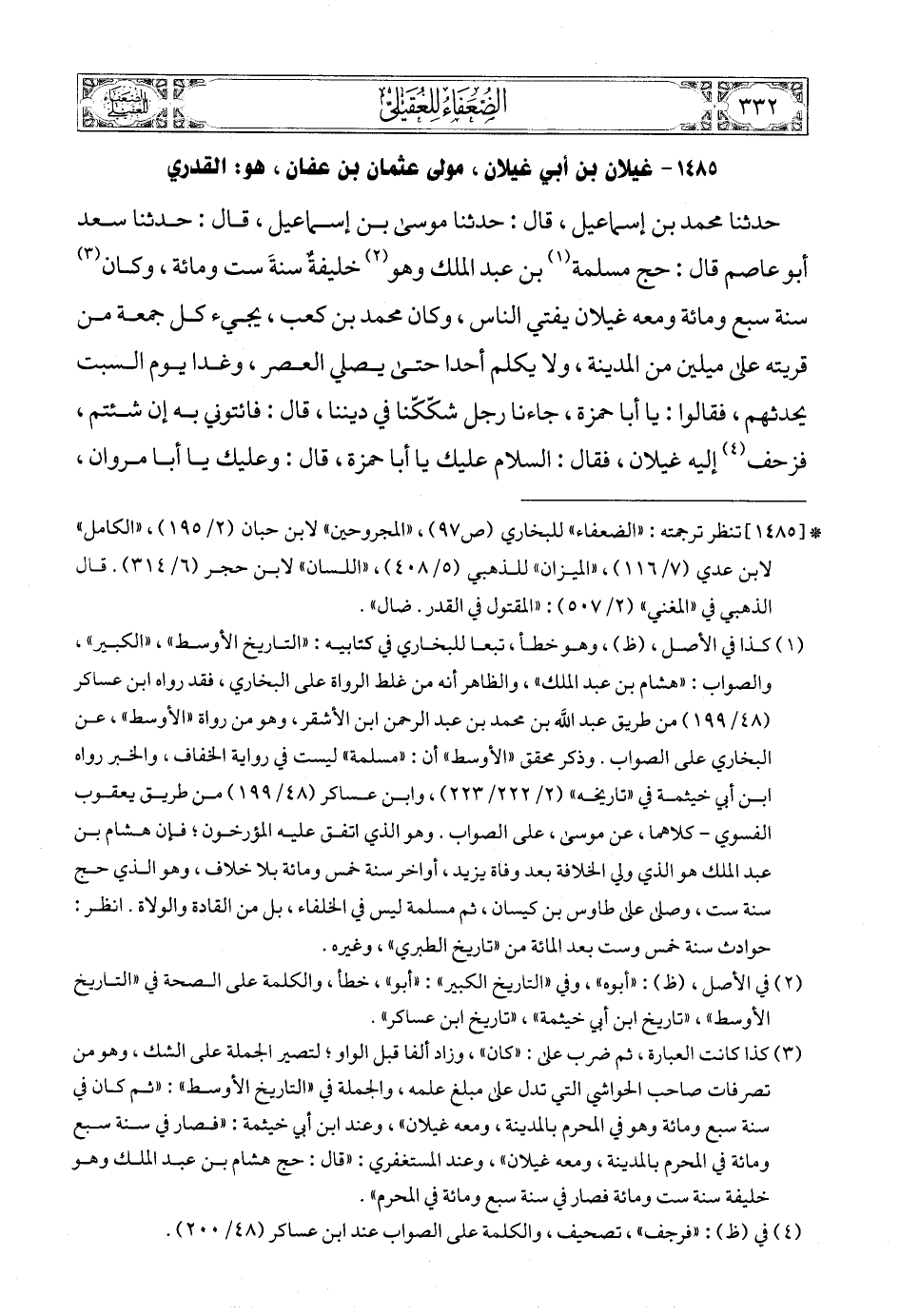 (1) * [1485] تنظر ترجمته: «الضعفاء» للبخاري (ص97) , «المجروحين» لابن حبان (2/ 195) , «الكامل» لابن عدي (7/ 116) , «الميزان» للذهبي (5/ 408) , «اللسان» لابن حجر (6/ 314). قال الذهبي في «المغني» (2/ 507): «المقتول في القدر. ضال».