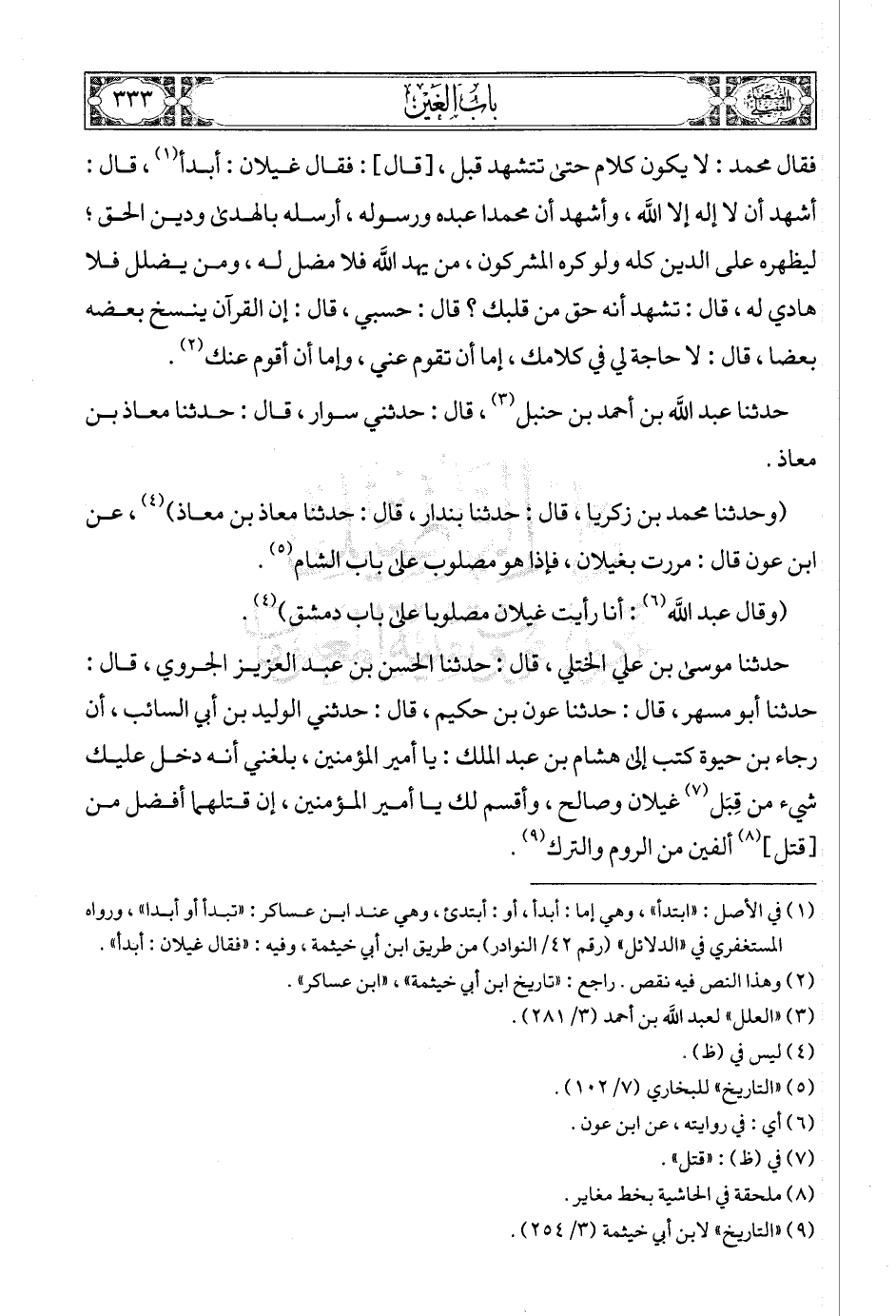 (1) في الأصل: «ابتدأ»، وهي إما: أبدأ، أو: أبتدئ، وهي عند ابن عساكر: «تبدأ أو أبدا»، ورواه المستغفري في «الدلائل» (رقم 42/النوادر) من طريق ابن أبي خيثمة، وفيه: «فقال غيلان: أبدأ».