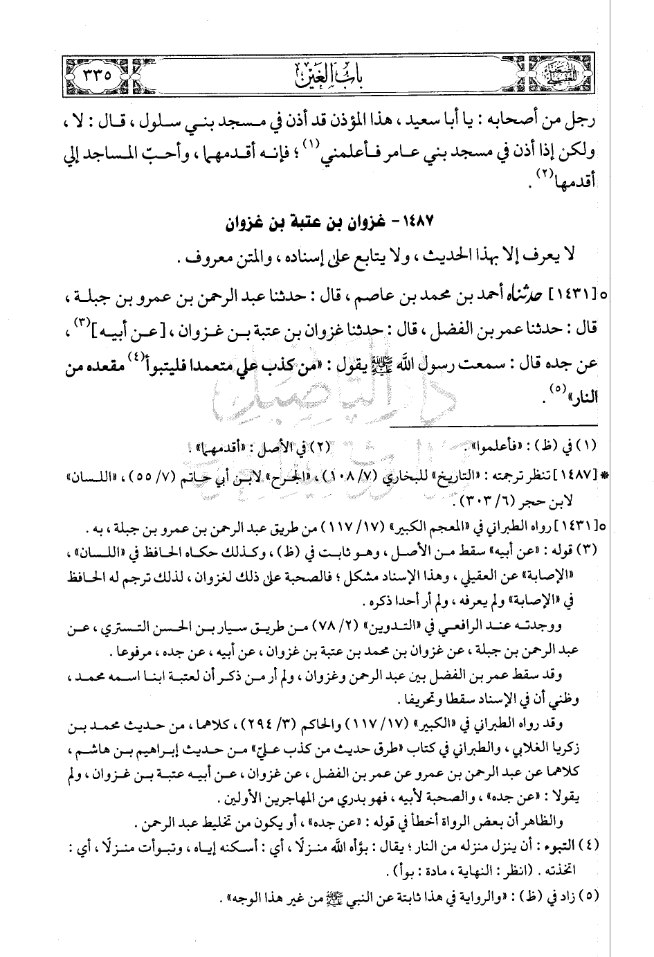 [1431] (4) حدثناه أحمد بن محمد بن عاصم، قال: حدثنا عبد الرحمن بن عمرو بن جبلة، قال: حدثنا عمر بن الفضل، قال: حدثنا غزوان بن عتبة بن غزوان، [عن أبيه] (5)، عن جده قال: سمعت رسول الله صلى الله عليه وسلمع يقول: «من كذب علي متعمدا فليتبوأ (6) مقعده من