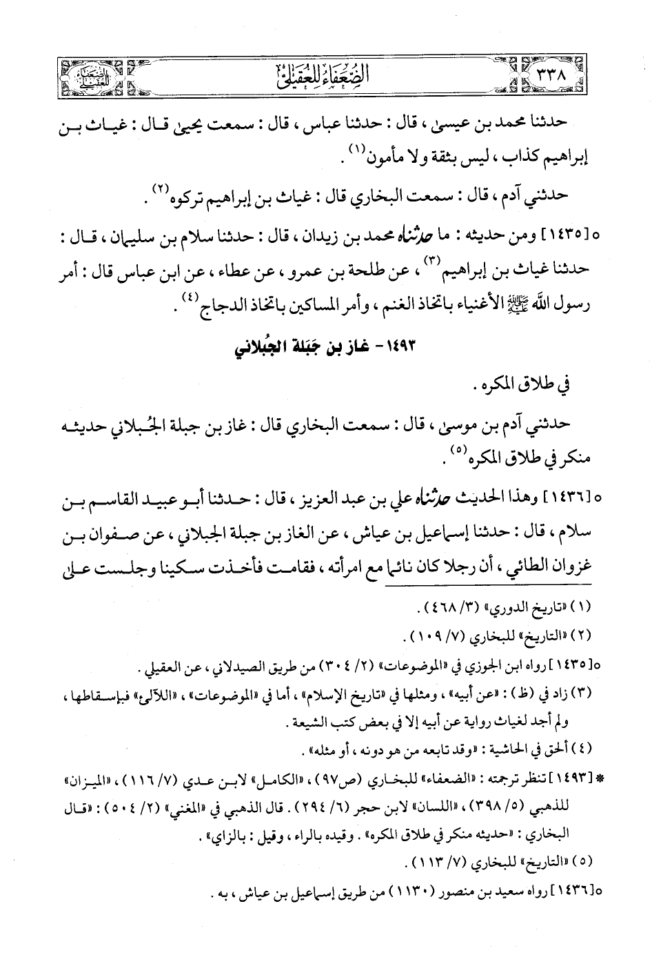 (1) * [1492] تنظر ترجمته: «الضعفاء» للبخاري (ص97) , «الضعفاء» للنسائي (ص226) , «المجروحين» لابن حبان (2/ 196) , «الكامل» لابن عدي (7/ 113) , «الضعفاء» لأبي نعيم (ص127). قال الذهبي في «المغني» (2/ 507): «تركوه، واتهم بالوضع».