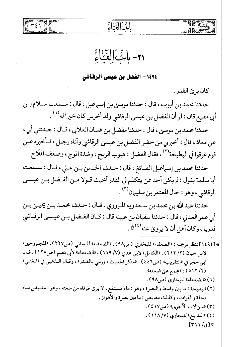 حدثنا عبد الله بن محمد بن سعدويه المروزي، قال: حدثنا محمد بن يحيى بن أبي عمر العدني، قال: حدثنا سفيان بن عيينة قال: كان الفضل بن عيسى الرقاشي قدريا، وكان أهل أن لا يروى عنه (5) (6) ?.