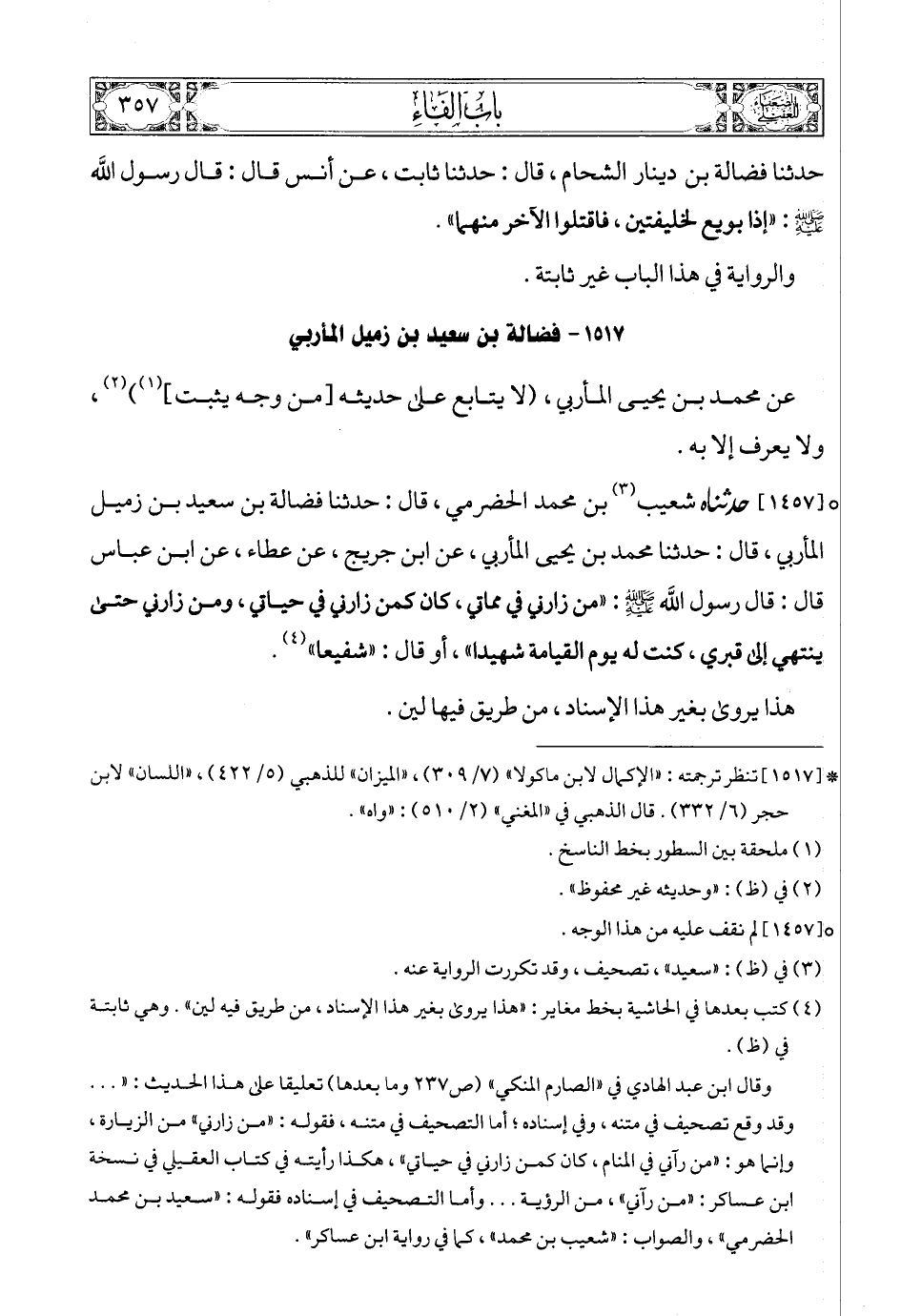 [1457] (4) حدثناه شعيب (5) بن محمد الحضرمي، قال: حدثنا فضالة بن سعيد بن زميل المأربي، قال: حدثنا محمد بن يحيى المأربي، عن ابن جريج، عن عطاء، عن ابن عباس قال: قال رسول الله صلى الله عليه وسلمع: «من زارني في مماتي، كان كمن زارني في حياتي، ومن زارني حتى ينتهي إلى قبري، كنت له يوم القيامة شهيدا»، أو قال: «شفيعا» (6).