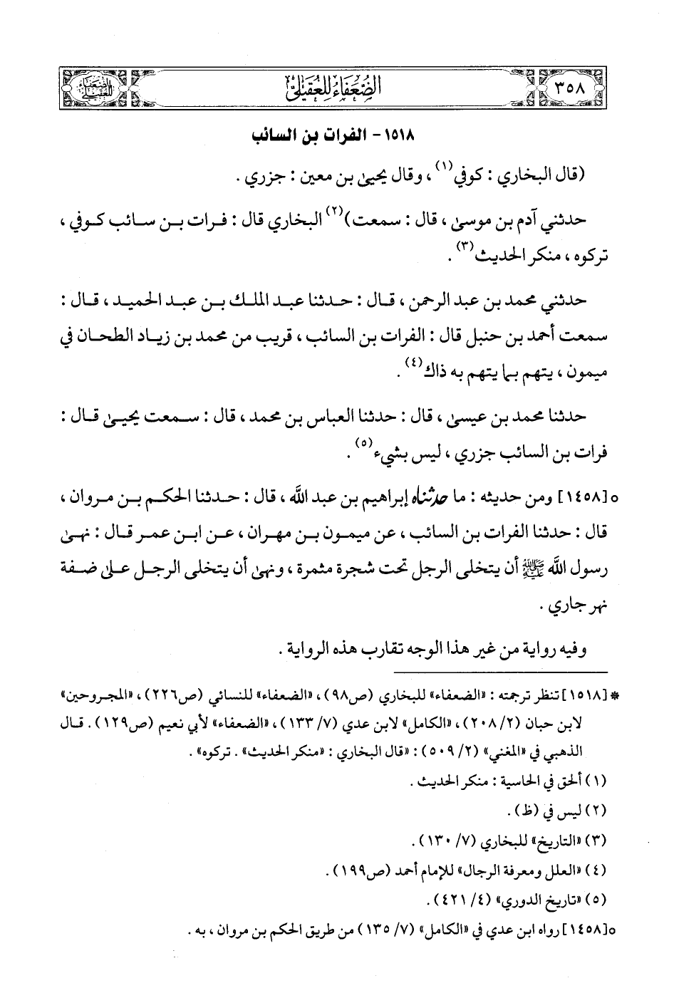 (1) * [1518] تنظر ترجمته: «الضعفاء» للبخاري (ص98) , «الضعفاء» للنسائي (ص226) , «المجروحين» لابن حبان (2/ 208) , «الكامل» لابن عدي (7/ 133) , «الضعفاء» لأبي نعيم (ص129). قال الذهبي في «المغني» (2/ 509): «قال البخاري: «منكر الحديث». تركوه».