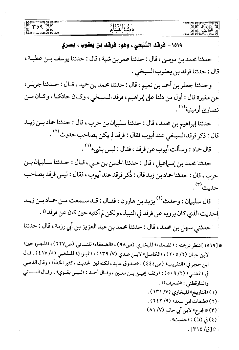 حدثنا محمد بن إسماعيل، قال: حدثنا الحسن بن علي، قال: حدثنا سليمان بن حرب، قال: حدثنا حماد بن زيد قال: ذُكر فرقد عند أيوب، فقال: ليس فرقد بصاحب حديث (4).