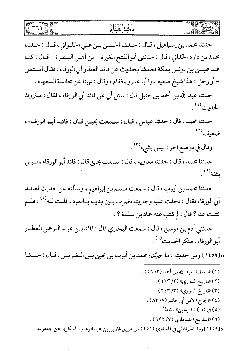 حدثنا محمد بن أيوب، قال: سمعت مسلم بن إبراهيم، وسألته عن حديث لفائد أبي الورقاء فقال: دخلت عليه وجاريته تضرب بين يديه بالعود، قلت له (5): فلم كتبت عنه ؟ قال: لم كتب عنه حماد بن سلمة ؟.
