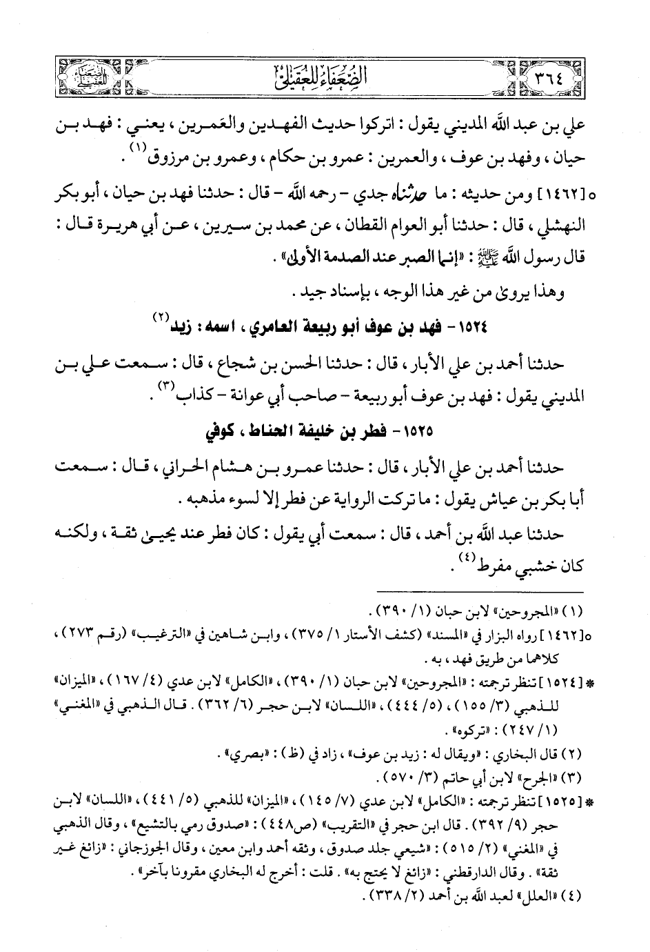 علي بن عبد الله المديني يقول: اتركوا حديث الفهدين والعَمرين، يعني: فهد بن حيان، وفهد بن عوف، والعمرين: عمرو بن حكام، وعمرو بن مرزوق (1).