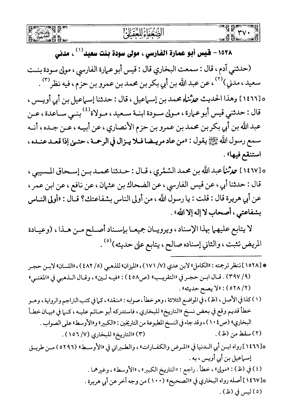 (حدثني آدم، قال: سمعت البخاري قال: قيس أبو عمارة الفارسي، مولى سودة بنت سعيد، مدني) (3)، عن عبد الله بن أبي بكر بن محمد بن عمرو بن حزم، فيه نظر (4).