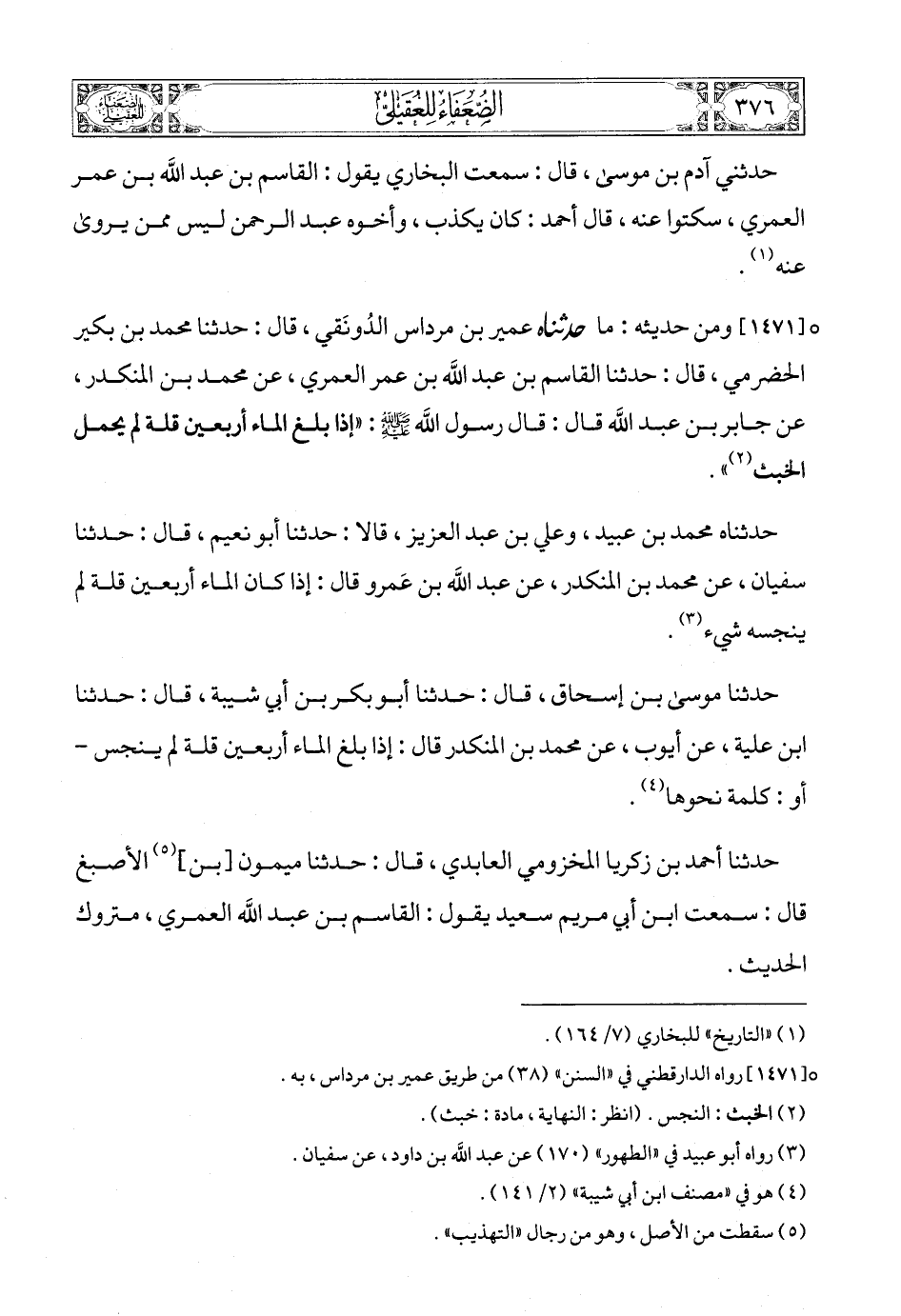 [1471] (2) ومن حديثه: ما حدثناه عمير بن مرداس الدُونَقي، قال: حدثنا محمد بن بكير الحضرمي، قال: حدثنا القاسم بن عبد الله بن عمر العمري، عن محمد بن المنكدر، عن جابر بن عبد الله قال: قال رسول الله صلى الله عليه وسلمع: «إذا بلغ الماء أربعين قلة لم يحمل الخبث (3)».