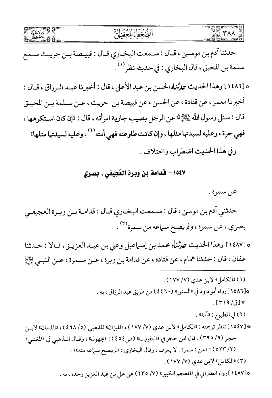 (5) * [1547] تنظر ترجمته: «الكامل» لابن عدي (7/ 177) , «الميزان» للذهبي (5/ 468) , «اللسان» لابن حجر (9/ 395). قال ابن حجر في «التقريب» (ص454): «مجهول» , وقال الذهبي في «المغني» (2/ 523): «عن: سمرة. لا يعرف، وقال البخاري: «لم يصح سماعه منه»».
