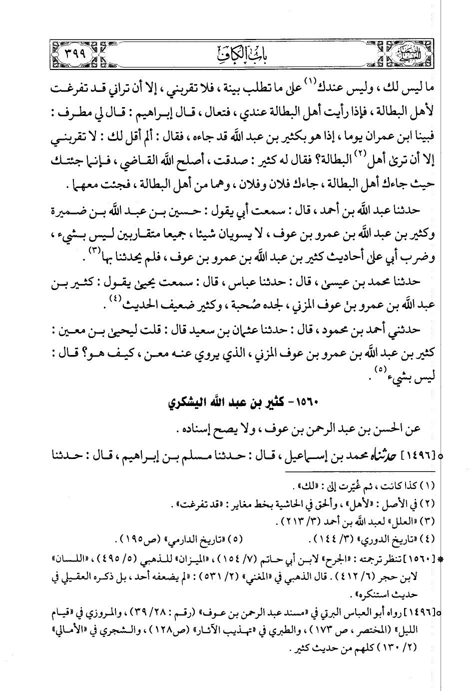 حدثني أحمد بن محمود، قال: حدثنا عثمان بن سعيد قال: قلت ليحيى بن معين: كثير بن عبد الله بن عمرو بن عوف المزني، الذي يروي عنه معن، كيف هو؟ قال: ليس بشيء (5).
