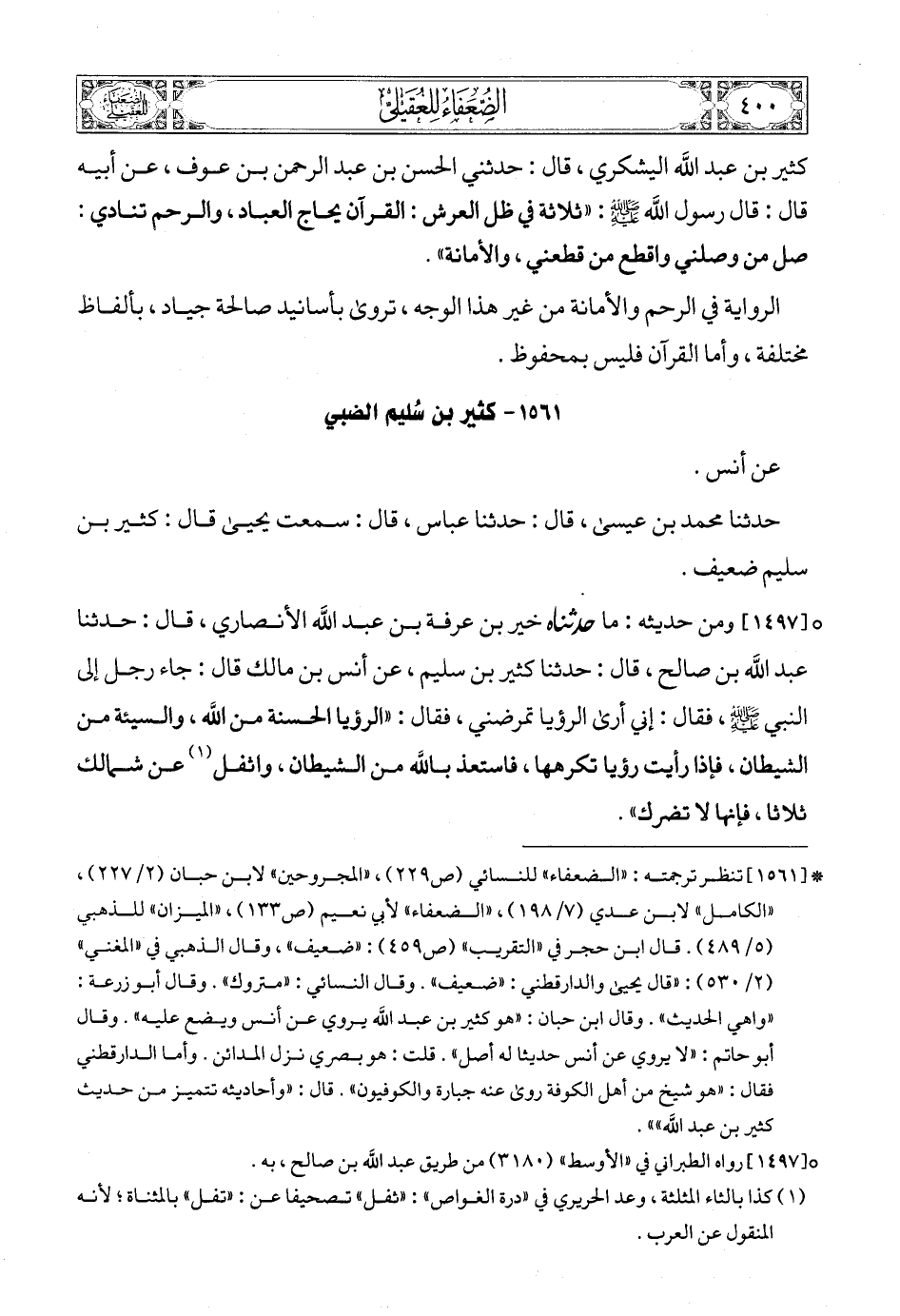 (1) * [1561] تنظر ترجمته: «الضعفاء» للنسائي (ص229) , «المجروحين» لابن حبان (2/ 227) , «الكامل» لابن عدي (7/ 198) , «الضعفاء» لأبي نعيم (ص133) , «الميزان» للذهبي (5/ 489). قال ابن حجر في «التقريب» (ص459): «ضعيف» , وقال الذهبي في «المغني» (2/ 530): «قال يحيى والدارقطني: «ضعيف». وقال النسائي: «متروك». وقال أبو زرعة: «واهي الحديث». وقال ابن حبان: «هو كثير بن عبد الله يروي عن أنس ويضع عليه». وقال أبو حاتم: «لا يروي عن أنس حديثا له أصل». قلت: هو بصري نزل المدائن. وأما الدارقطني فقال: «هو شيخ من أهل الكوفة روى عنه جبارة والكوفيون». قال: «وأحاديثه تتميز من حديث كثير بن عبد الله»».