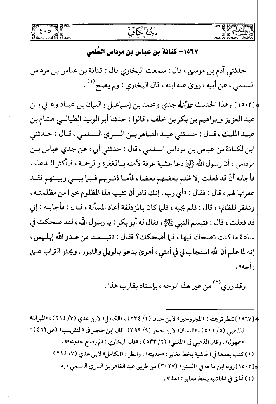 حدثني آدم بن موسى، قال: سمعت البخاري قال: كنانة بن عباس بن مرداس السلمي، عن أبيه، روى عنه ابنه، قال البخاري: ولم يصح (2).