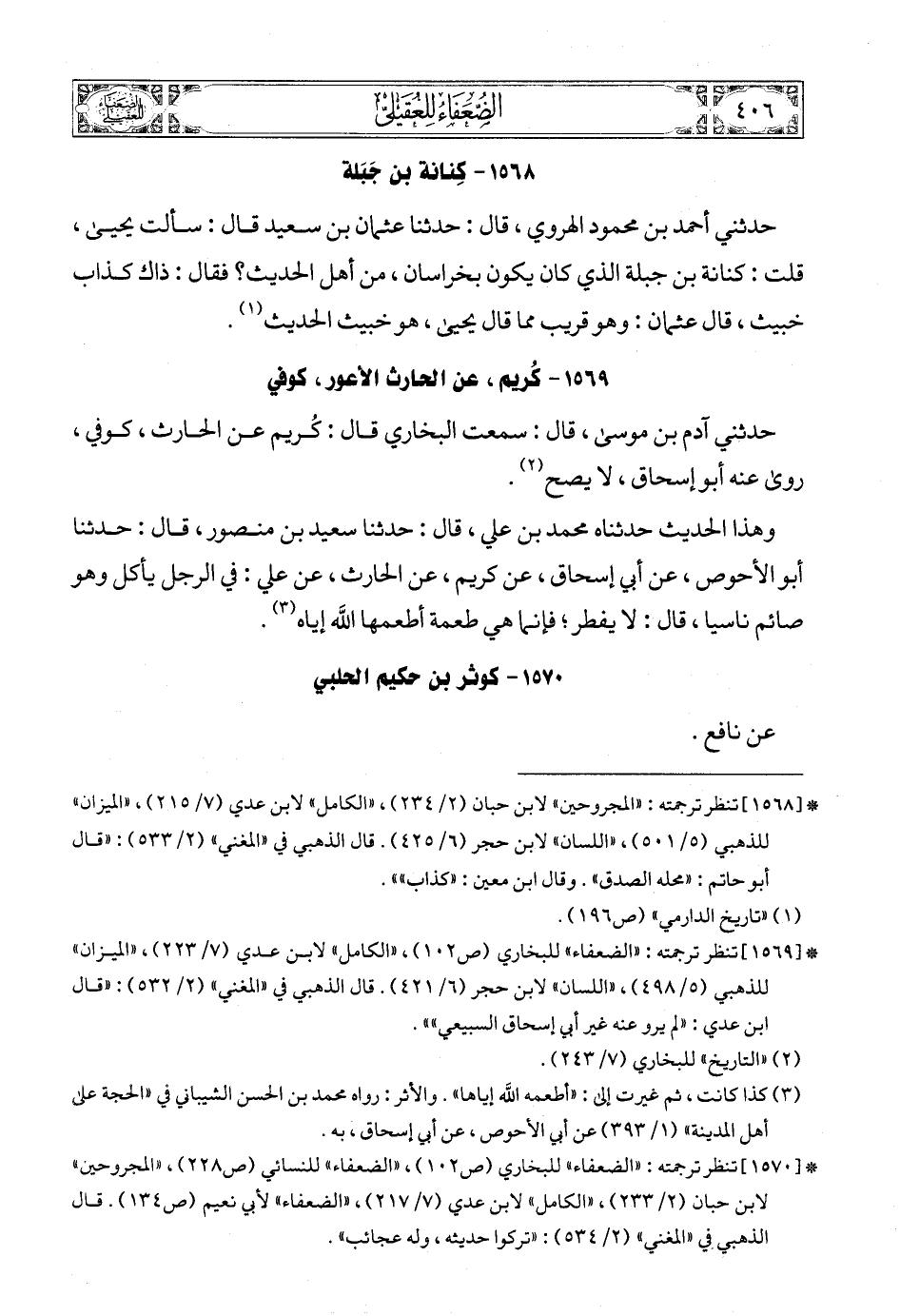 (6) * [1570] تنظر ترجمته: «الضعفاء» للبخاري (ص102) , «الضعفاء» للنسائي (ص228) , «المجروحين» لابن حبان (2/ 233) , «الكامل» لابن عدي (7/ 217) , «الضعفاء» لأبي نعيم (ص134). قال الذهبي في «المغني» (2/ 534): «تركوا حديثه، وله عجائب».