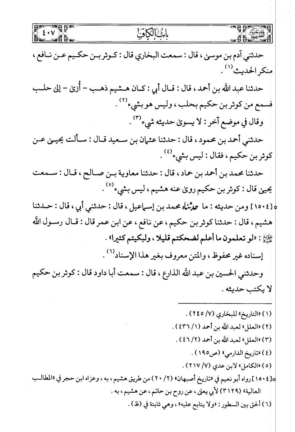 حدثنا عبد الله بن أحمد، قال: قال أبي: كان هشيم ذهب - أُرَى - إلى حلب فسمع من كوثر بن حكيم بحلب، وليس هو بشيء (2).