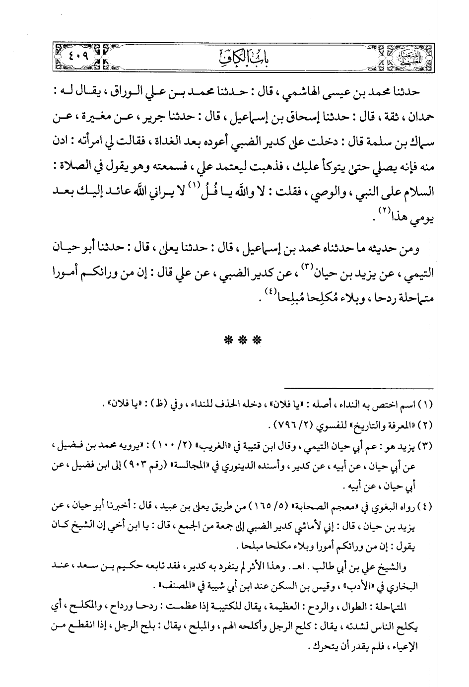 حدثنا محمد بن عيسى الهاشمي، قال: حدثنا محمد بن علي الوراق، يقال له: حمدان، ثقة، قال: حدثنا إسحاق بن إسماعيل، قال: حدثنا جرير، عن مغيرة، عن سماك بن سلمة قال: دخلت على كدير الضبي أعوده بعد الغداة، فقالت لي امرأته: ادن منه فإنه يصلي حتى يتوكأ عليك، فذهبت ليعتمد علي، فسمعته وهو يقول في الصلاة: السلام على النبي، والوصي، فقلت: لا والله يا فُلُ (1) لا يراني الله عائد إليك بعد يومي هذا (2).