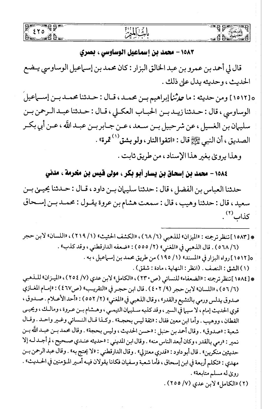 (4) * [1584] تنظر ترجمته: «الضعفاء» للنسائي (ص230) , «الكامل» لابن عدي (7/ 254) , «الميزان» للذهبي (6/ 56) , «اللسان» لابن حجر (9/ 402). قال ابن حجر في «التقريب» (ص467): «إمام المغازي صدوق يدلس ورمي بالتشيع والقدر» , وقال الذهبي في «المغني» (2/ 552): «أحد الأعلام. صدوق، قوي الحديث إمام، لا سيما في السير، وقد كذبه سليمان التيمي، وهشام بن عروة، ومالك، ويحيى القطان، ووهيب. وأما ابن معين فقال: «ثقة ليس بحجة». وكذا قال النسائي وغير واحد. وقال شعبة: «صدوق». وقال أحمد بن حنبل: «حسن الحديث، وليس بحجة». وقال محمد بن عبد الله بن نمير: «رمي بالقدر، وكان أبعد الناس منه». وقال ابن المديني: «حديثه عندي صحيح، لم أجد له إلا حديثين منكرين». قال أبو داود: «قدري معتزلي». وقال الدارقطني: «لا يحتج به». وقال عبد الرحمن بن مهدي: «تكلم أربعة في ابن إسحاق، فأما شعبة وسفيان فكانا يقولان فيه أمير المؤمنين في الحديث». روى له مسلم متابعة».