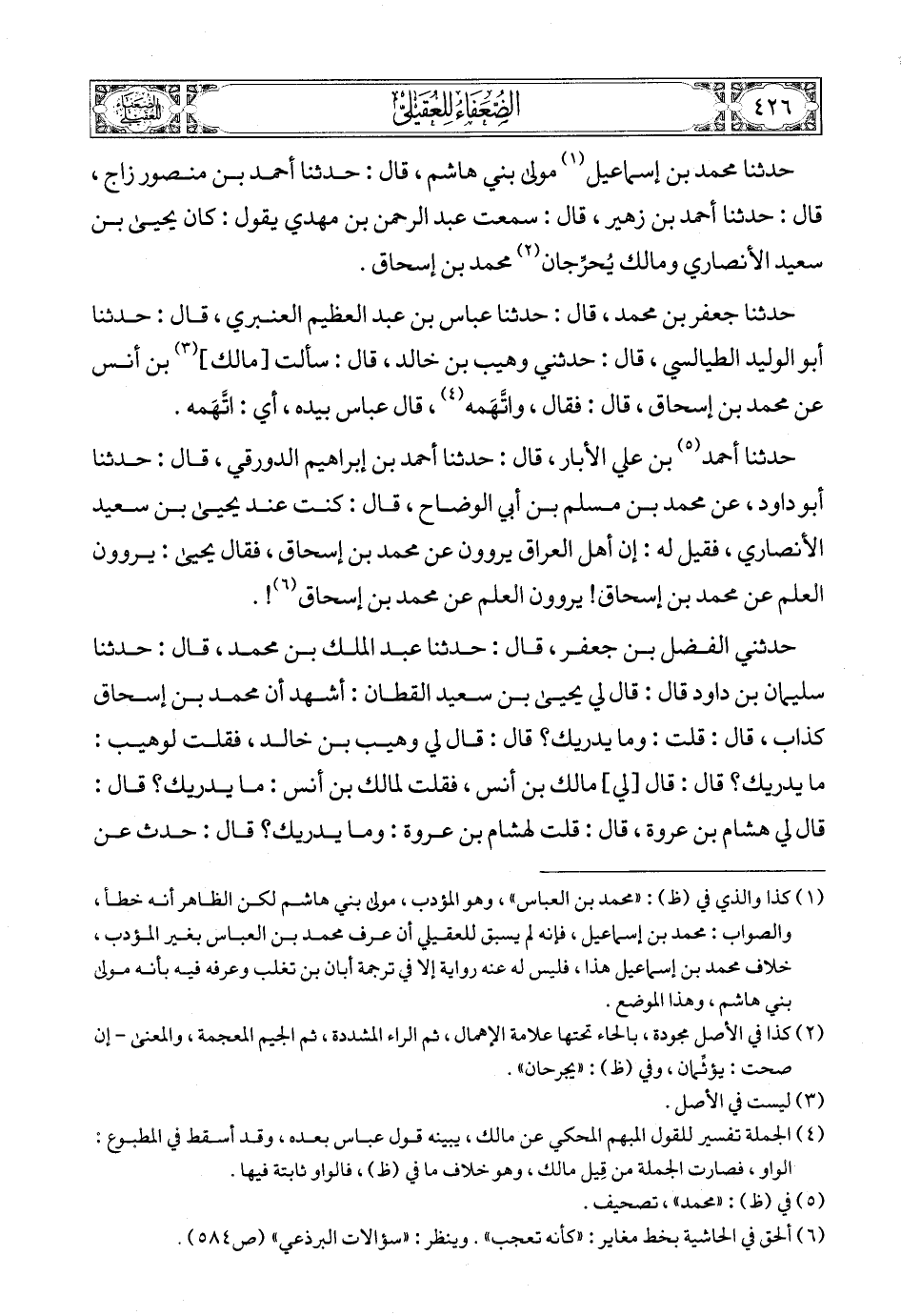 (1) كذا والذي في (ظ): «محمد بن العباس»، وهو المؤدب، مولى بني هاشم لكن الظاهر أنه خطأ، والصواب: محمد بن إسماعيل، فإنه لم يسبق للعقيلي أن عرف محمد بن العباس بغير المؤدب، خلاف محمد بن إسماعيل هذا، فليس له عنه رواية إلا في ترجمة أبان بن تغلب وعرفه فيه بأنه مولى بني هاشم، وهذا الموضع.