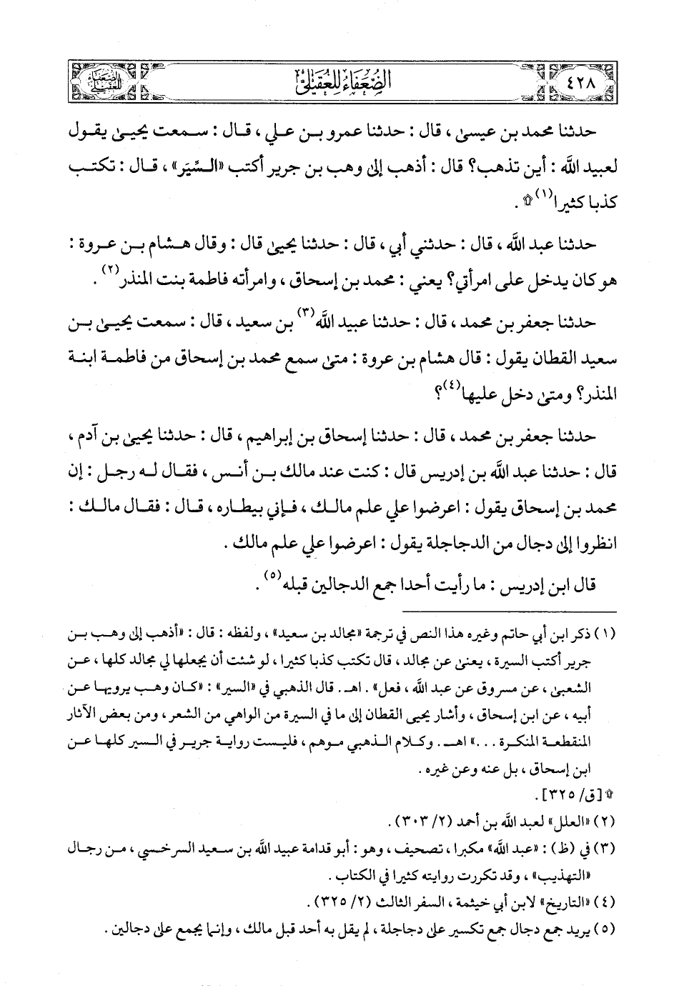 (1) ذكر ابن أبي حاتم وغيره هذا النص في ترجمة «مجالد بن سعيد»، ولفظه: قال: «أذهب إلى وهب بن جرير أكتب السيرة، يعنى عن مجالد، قال تكتب كذبا كثيرا، لو شئت أن يجعلها لي مجالد كلها، عن الشعبى، عن مسروق عن عبد الله، فعل». اهـ. قال الذهبي في «السير»: «كان وهب يرويها عن أبيه، عن ابن إسحاق، وأشار يحيى القطان إلى ما في السيرة من الواهي من الشعر، ومن بعض الآثار المنقطعة المنكرة ... » اهـ. وكلام الذهبي موهم، فليست رواية جرير في السير كلها عن ابن إسحاق، بل عنه وعن غيره.
