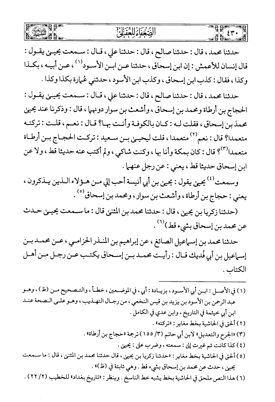 (5) ألحق في الحاشية بخط مغاير: «حدثنا زكريا بن يحيى، قال حدثنا محمد بن المثنى، قال: ما سمعت يحيى، حدث عن محمد بن إسحاق بشيء قط. وهي ثابتة في (ظ)».