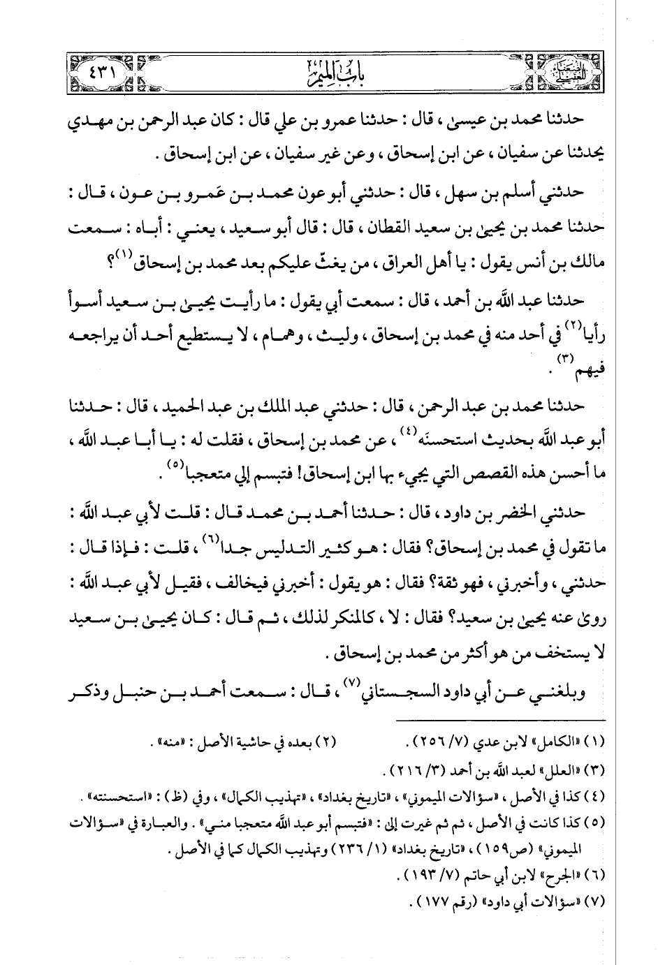 حدثني الخضر بن داود، قال: حدثنا أحمد بن محمد قال: قلت لأبي عبد الله: ما تقول في محمد بن إسحاق؟ فقال: هو كثير التدليس جدا (6)، قلت: فإذا قال: حدثني، وأخبرني، فهو ثقة؟ فقال: هو يقول: أخبرني فيخالف، فقيل لأبي عبد الله: روى عنه يحيى بن سعيد؟ فقال: لا، كالمنكر لذلك، ثم قال: كان يحيى بن سعيد لا يستخف من هو أكثر من محمد بن إسحاق.