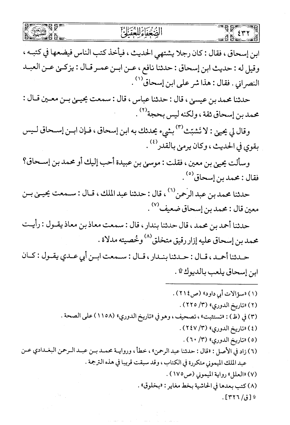 حدثنا محمد بن عبد الرحمن (6)، قال: حدثنا عبد الملك، قال: سمعت يحيى بن معين قال: محمد بن إسحاق ضعيف (7).