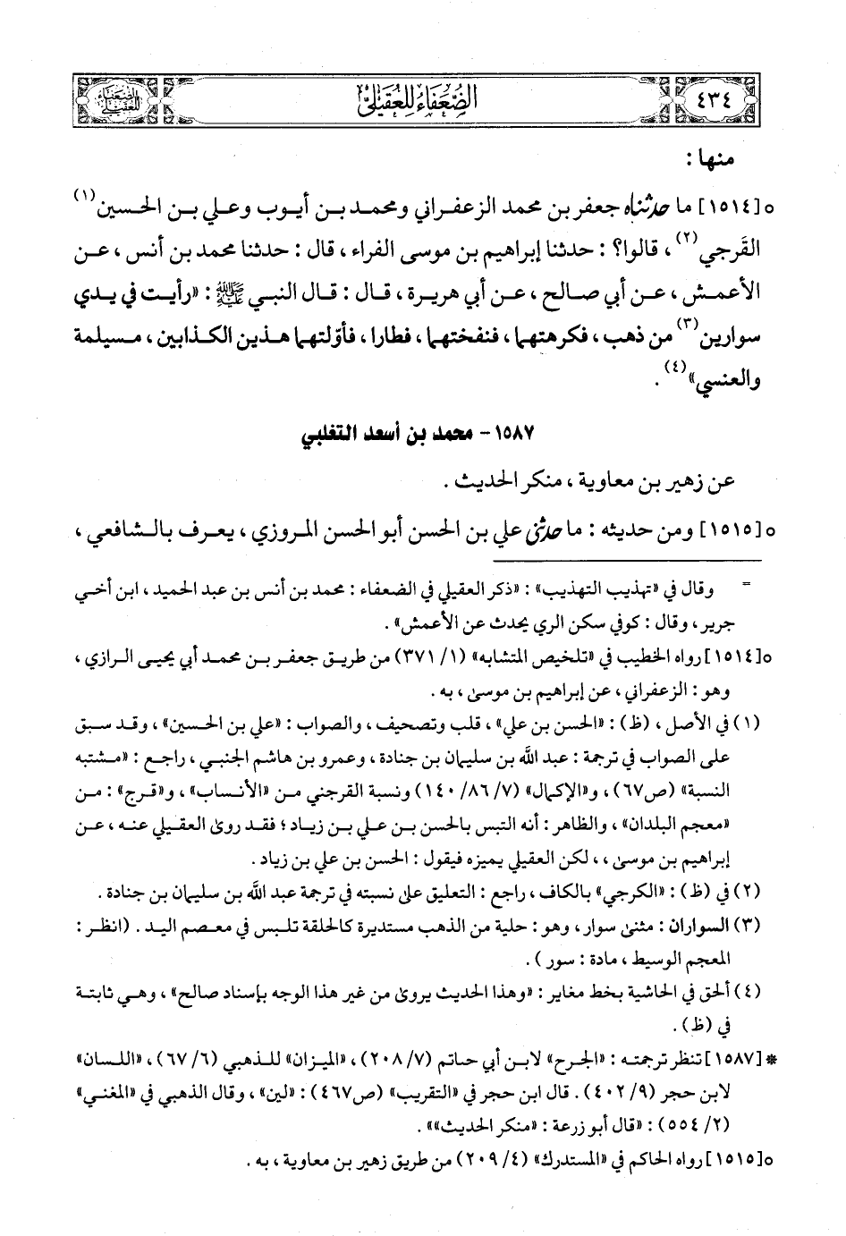 [1514] (1) ما حدثناه جعفر بن محمد الزعفراني ومحمد بن أيوب وعلي بن الحسين (2) القَرجي (3)، قالوا؟: حدثنا إبراهيم بن موسى الفراء، قال: حدثنا محمد بن أنس، عن الأعمش، عن أبي صالح، عن أبي هريرة، قال: قال النبي صلى الله عليه وسلمع: «رأيت في يدي سوارين (4) من ذهب، فكرهتهما، فنفختهما، فطارا، فأوّلتهما هذين الكذابين، مسيلمة والعنسي» (5).