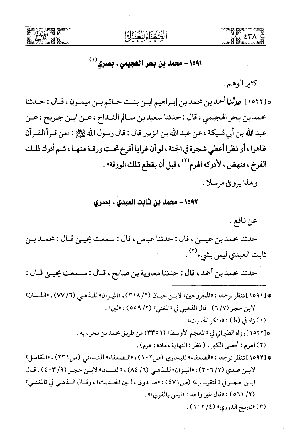 (1) * [1591] تنظر ترجمته: «المجروحين» لابن حبان (2/ 318) , «الميزان» للذهبي (6/ 77) , «اللسان» لابن حجر (7/ 6). قال الذهبي في «المغني» (2/ 559): «لين».