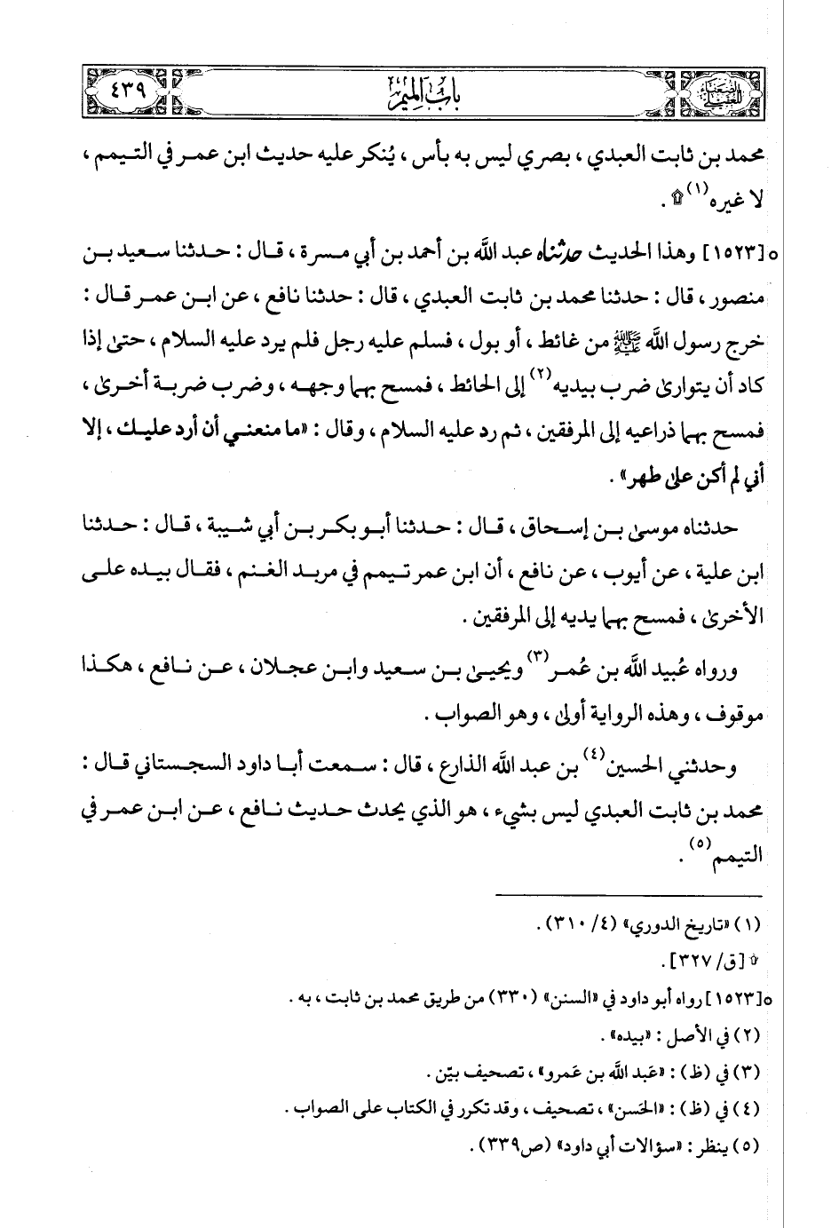 وحدثني الحسين (6) بن عبد الله الذارع، قال: سمعت أبا داود السجستاني قال: محمد بن ثابت العبدي ليس بشيء، هو الذي يحدث حديث نافع، عن ابن عمر في التيمم (7).