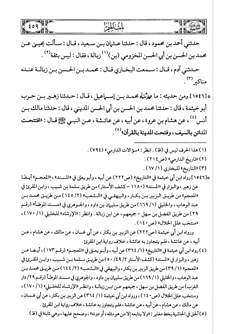 (5) رواه ابن أبي خيثمة في «التاريخ» (1/ 364) عن أبيه، وأبو يعلى في «المعجم» (رقم 173)، أيضا عن زهير، والبزار في «المسند» (كشف الأستار 2/ 49/50) من طريق سلمة بن شبيب، وابن المقرئ في «المعجم» (1/ 39) من طريق الزبير بن بكار، والبيهقي في «الشعب» (2/ 144) من طريق محمد بن عبد الوهاب، والخليلي (1/ 169) من طريق سليمان بن داود، والجوهري في مسند الموطأ (رقم 29/دار الغرب) من طريق الفضل بن سهل، جميعهم عن ابن زبالة، وانظر «الإرشاد للخليلي» (1/ 170)، ومنتخب علل الخلال (ص140)، ورواه ابن أبي خيثمة (1/ 364) عن الزبير بن بكار، عن أبي غسان، عن مالك، عن هشام، عن أبيه، عن عائشة، فلم يتجاوز به عائشة، خلاف رواية ابن المقرئ.