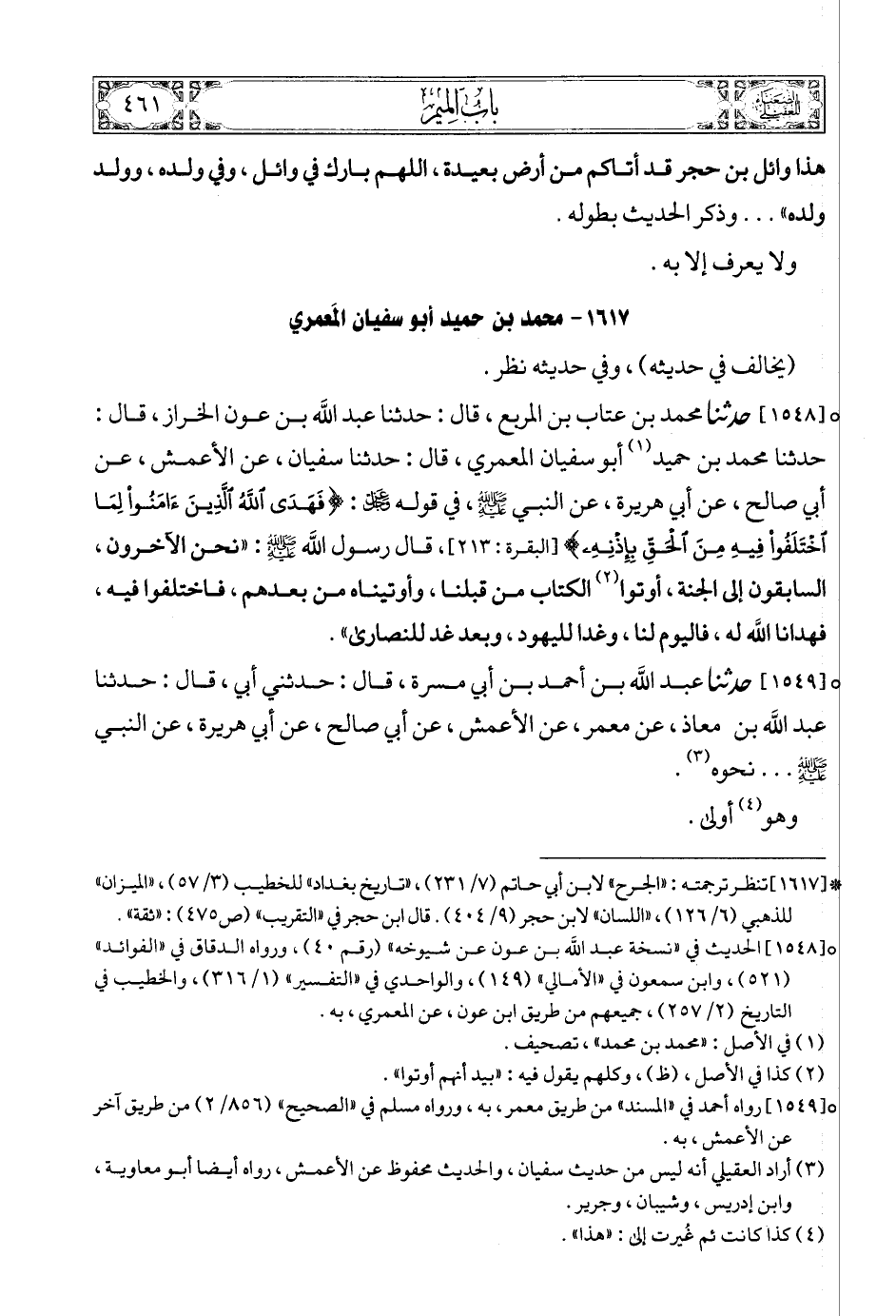 [1548] (2) حدثنا محمد بن عتاب بن المربع، قال: حدثنا عبد الله بن عون الخراز، قال: حدثنا محمد بن حميد (3) أبو سفيان المعمري، قال: حدثنا سفيان، عن الأعمش، عن أبي صالح، عن أبي هريرة، عن النبي صلى الله عليه وسلمع، في قوله عز وجل: {فَهَدَى اللَّهُ الَّذِينَ آمَنُوا لِمَا اخْتَلَفُوا فِيهِ مِنَ الْحَقِّ بِإِذْنِهِي} [البقرة: 213]، قال رسول الله صلى الله عليه وسلمع: «نحن الآخرون، السابقون إلى الجنة، أوتوا (4) الكتاب من قبلنا، وأوتيناه من بعدهم، فاختلفوا فيه، فهدانا الله له، فاليوم لنا، وغدا لليهود، وبعد غد للنصارى».