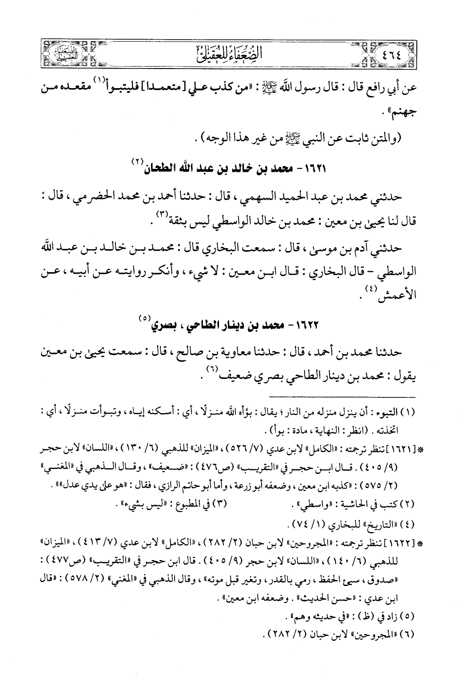 (2) * [1621] تنظر ترجمته: «الكامل» لابن عدي (7/ 526) , «الميزان» للذهبي (6/ 130) , «اللسان» لابن حجر (9/ 405). قال ابن حجر في «التقريب» (ص476): «ضعيف» , وقال الذهبي في «المغني» (2/ 575): «كذبه ابن معين، وضعفه أبو زرعة، وأما أبو حاتم الرازي، فقال: «هو على يدي عدل»».