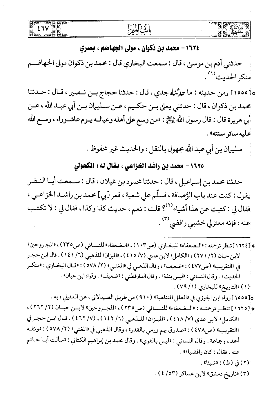 (1) * [1624] تنظر ترجمته: «الضعفاء» للبخاري (ص103) , «الضعفاء» للنسائي (ص235) , «المجروحين» لابن حبان (2/ 271) , «الكامل» لابن عدي (7/ 415) , «الميزان» للذهبي (6/ 141). قال ابن حجر في «التقريب» (ص477): «ضعيف» , وقال الذهبي في «المغني» (2/ 578): «قال البخاري: «منكر الحديث». وقال النسائي: «ليس بثقة». وقال الدارقطني: «ضعيف». وقواه ابن حبان».