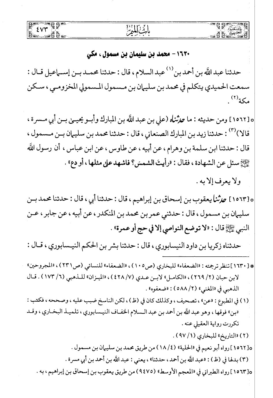 حدثنا عبد الله بن أحمد بن (2) عبد السلام، قال: حدثنا محمد بن إسماعيل قال: سمعت الحميدي يتكلم في محمد بن سليمان بن مسمول المسمولي المخزومي، سكن مكة (3).
