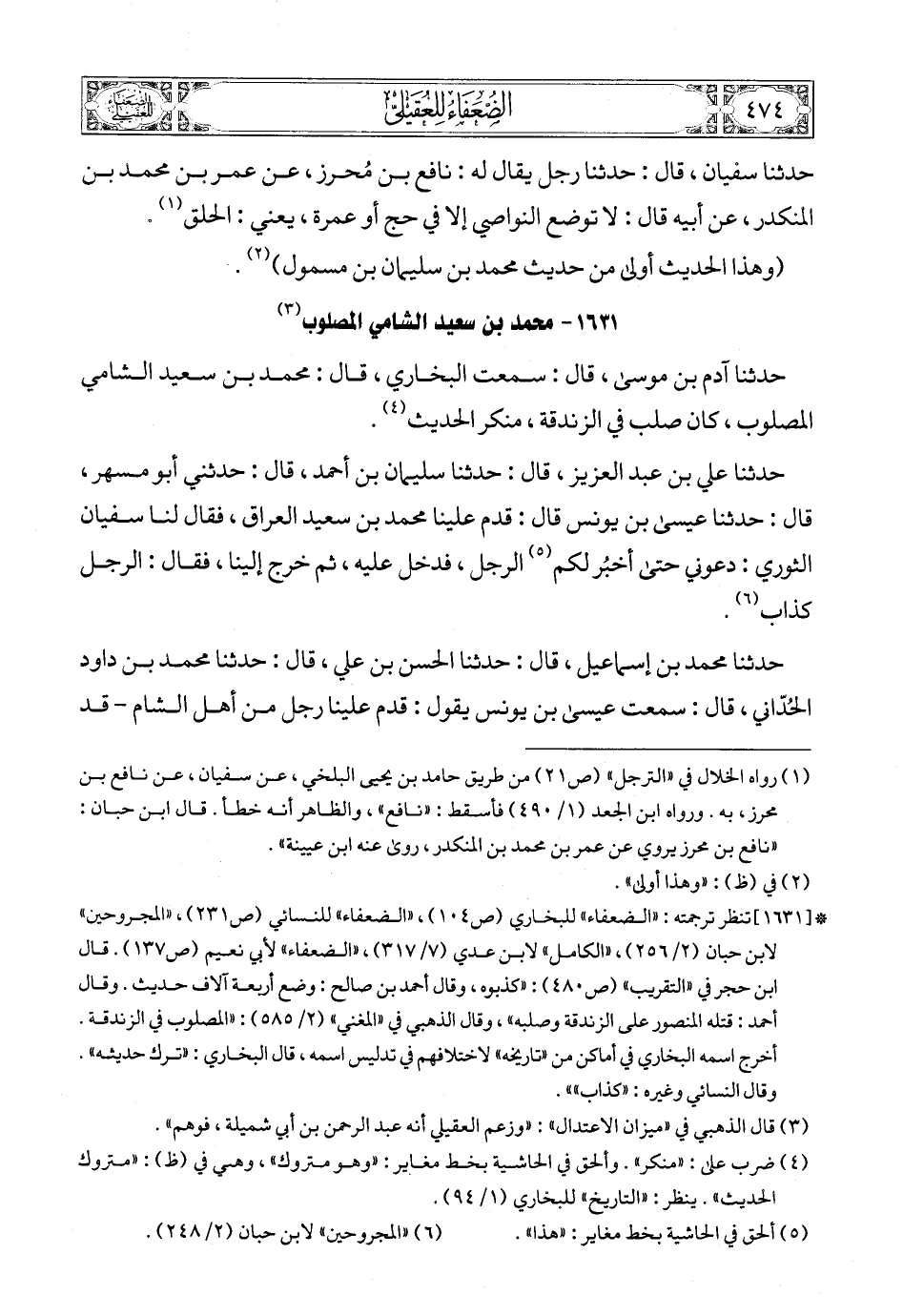 (3) * [1631] تنظر ترجمته: «الضعفاء» للبخاري (ص104) , «الضعفاء» للنسائي (ص231) , «المجروحين» لابن حبان (2/ 256) , «الكامل» لابن عدي (7/ 317) , «الضعفاء» لأبي نعيم (ص137). قال ابن حجر في «التقريب» (ص480): «كذبوه، وقال أحمد بن صالح: وضع أربعة آلاف حديث. وقال أحمد: قتله المنصور على الزندقة وصلبه» , وقال الذهبي في «المغني» (2/ 585): «المصلوب في الزندقة. أخرج اسمه البخاري في أماكن من «تاريخه» لاختلافهم في تدليس اسمه، قال البخاري: «ترك حديثه». وقال النسائي وغيره: «كذاب»».