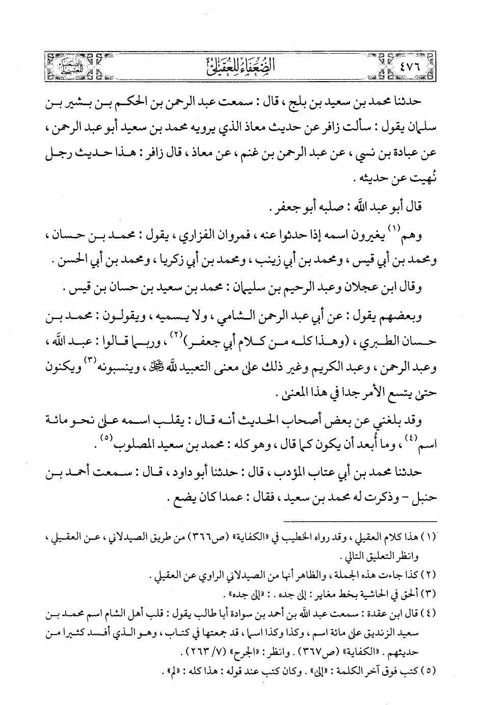 (2) كذا جاءت هذه الجملة، والظاهر أنها من الصيدلاني الراوي عن العقيلي.