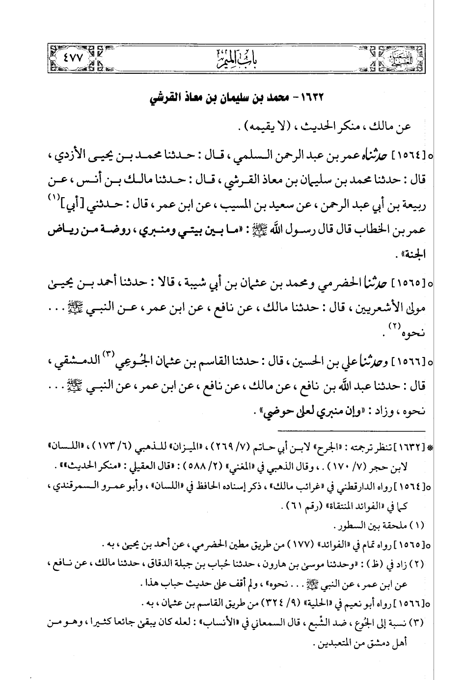 [1564] (2) حدثناه عمر بن عبد الرحمن السلمي، قال: حدثنا محمد بن يحيى الأزدي، قال: حدثنا محمد بن سليمان بن معاذ القرشي، قال: حدثنا مالك بن أنس، عن ربيعة بن أبي عبد الرحمن، عن سعيد بن المسيب، عن ابن عمر، قال: حدثني [أبي] (3) عمر بن الخطاب قال قال رسول الله صلى الله عليه وسلمع: «ما بين بيتي ومنبري، روضة من رياض الجنة».