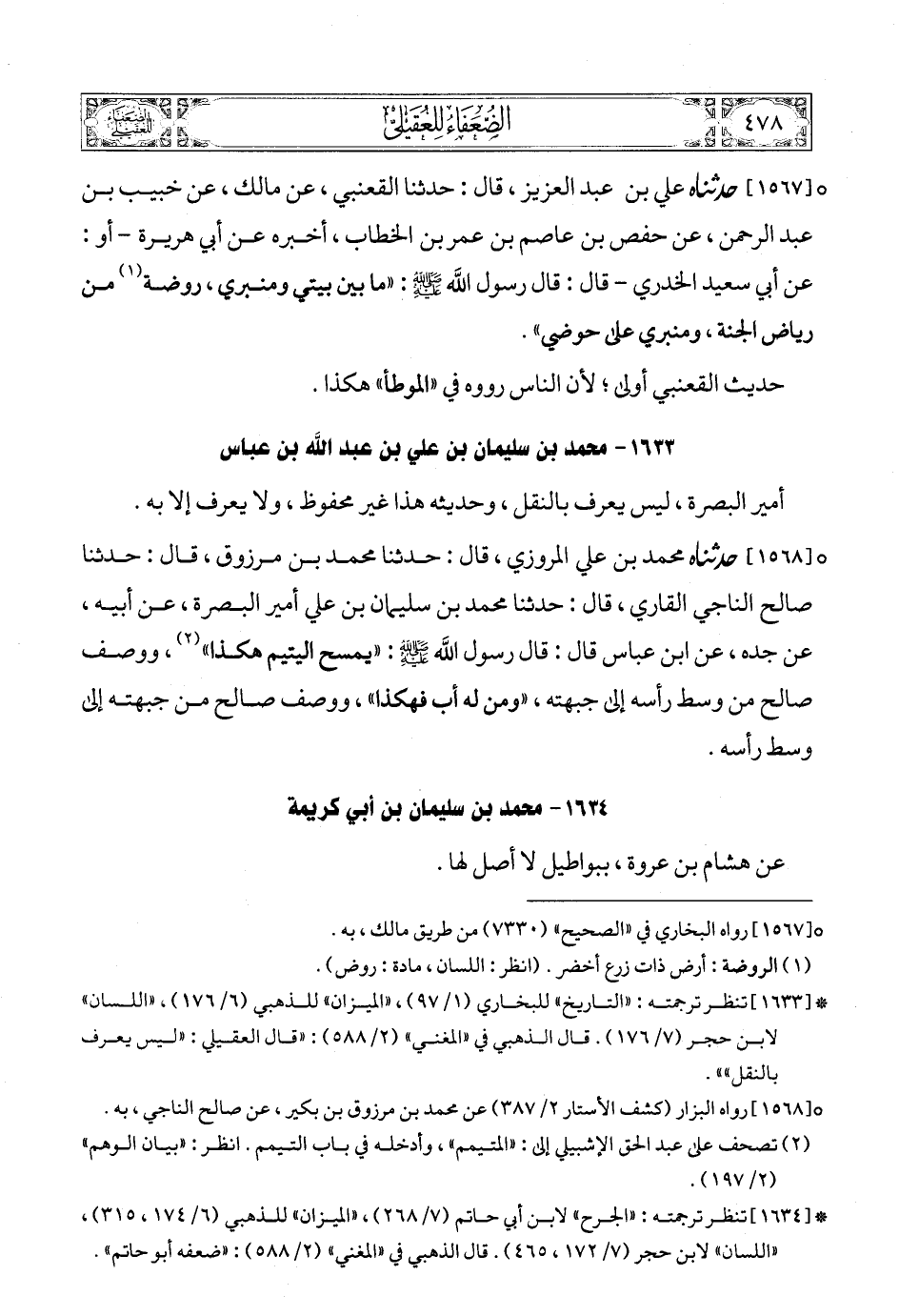 (3) * [1633] تنظر ترجمته: «التاريخ» للبخاري (1/ 97)، «الميزان» للذهبي (6/ 176) , «اللسان» لابن حجر (7/ 176). قال الذهبي في «المغني» (2/ 588): «قال العقيلي: «ليس يعرف بالنقل»».